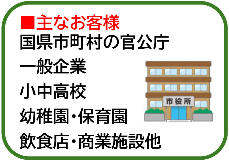 また、お客様も創業当初からの小中学校を始め現在では国・県・県内の市町村等の官公庁様一般企業・飲食店・商業施設と広がっています。加えて昨今は社会全体が「働き方改革」が声高に叫ばれていますが、働き方改革はオフィス改革と密接に関係しています。生産性を高めるためのオフィスづくりの需要が高まっています。